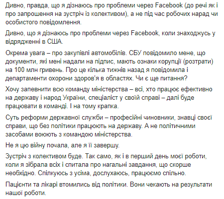 "Странно, правда, что я узнаю о проблемах через Facebook (кстати как и о приглашении на встречу с коллективом), а не во время рабочих совещаний или личного сообщения. Удивительно, что я узнаю о проблемах через Facebook, когда нахожусь в командировке в США", - написала Скалецкая.
