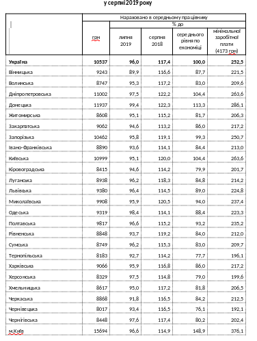 По данным статведомства, наибольший рост средней зарплаты штатных работников в августе 2019 года по сравнению с августом 2018 года наблюдался в Донецкой (на 22,3%), Днепропетровской (на 22,2%), Николаевской (на 20,5%), Киевской (на 20%), Ривненской (на 19,2%), Запорожской (на 19,1%), Луганской (на 18,3%), Черниговской (на 17,4%), Волынской и Хмельницкой (на 17,2%), Харьковской (на 16,8%), Винницкой (на 16,6%), Черкасской и Черновицкой (на 16,5%), Сумской (на 15,3%), Полтавской и Житомирской (на 15,2%), Херсонской (на 14,8%), Львовской (на 14,5%), Кировоградской и Тернопольской (на 14,2%), Ивано-Франковской и Одесской (на 14,1%), Закарпатской (на 13,2%) областях и в Киеве (на 14,9%)