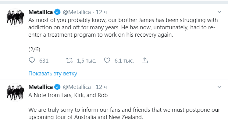 Американская группа Metallica отменила тур по Австралии и Новой Зеландии из-за того, что ее солист Джеймс Хетфилд лег в реабилитационный центр. Об этом сообщается в официальном Twitter группы.