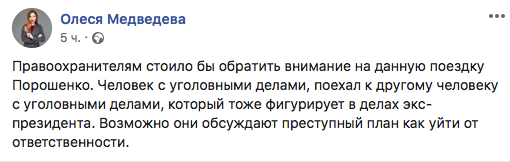 Журналист "Страны" Олеся Медведева в соцсети также высказала мнение, что правоохранителям стоило бы обратить внимание на данную поездку Порошенко: "Человек с уголовными делами, поехал к другому человеку с уголовными делами, который тоже фигурирует в делах экс-президента. Возможно они обсуждают преступный план как уйти от ответственности".
