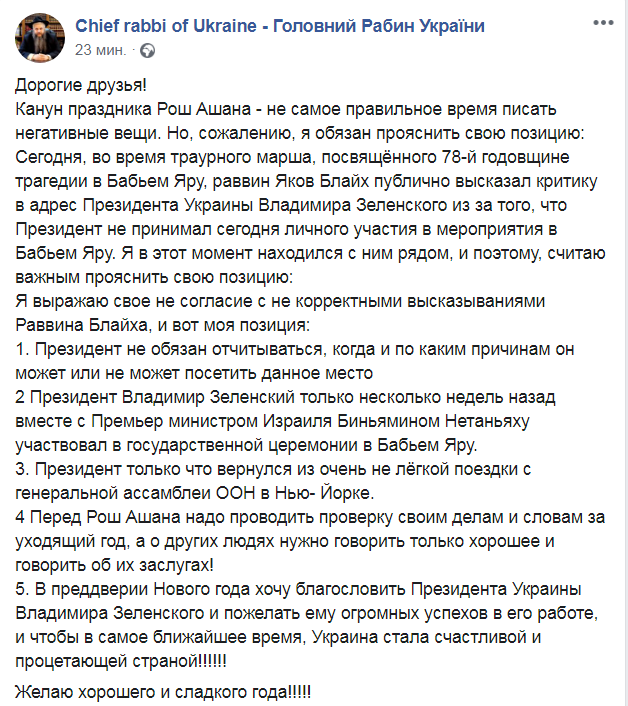 На своей странице в Facebook Рав Моше назвал высказывание Блайха некорректным и объяснил, почему Зеленский прав.