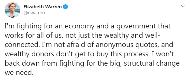 "Я борюсь за экономику и правительство, которое работает для всех нас, а не только для богатых и влиятельных. Я не боюсь анонимных цитат, и богатые доноры не могут купить процесс выборов. Я не отступлюсь от борьбы за большие структурные изменения, которые нам необходимы", заявила Уоррен.