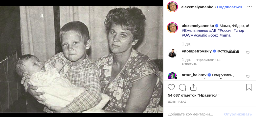 Российский боец смешанных единоборств Александр Емельяненко в честь дня рождения своего брата Федора Емельяненко - четырёхкратного чемпиона мира по смешанным боевым искусствам - выложил детское семейное фото в своем Instagram.