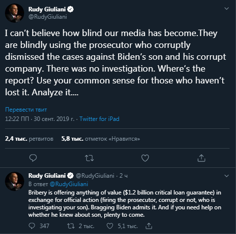 По мнению адвоката Трампа, Байден причастен к взяточничеству. Джулиани отметил, что речь о предложении займа в $1,2 млрд, "в обмен на официальные действия (увольнение прокурора, коррумпированного или нет, который расследует дело вашего сына)".