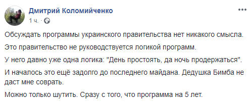 "Обсуждать программы украинского правительства нет никакого смысла. Это правительство не руководствуется логикой программ. У него давно уже одна логика: "День простоять, да ночь продержаться". И началось это ещё задолго до последнего майдана. Дедушка Бимба не даст мне соврать. Можно только шутить. Сразу с того, что программа на 5 лет" - пишет Дмитрий Коломийченко.