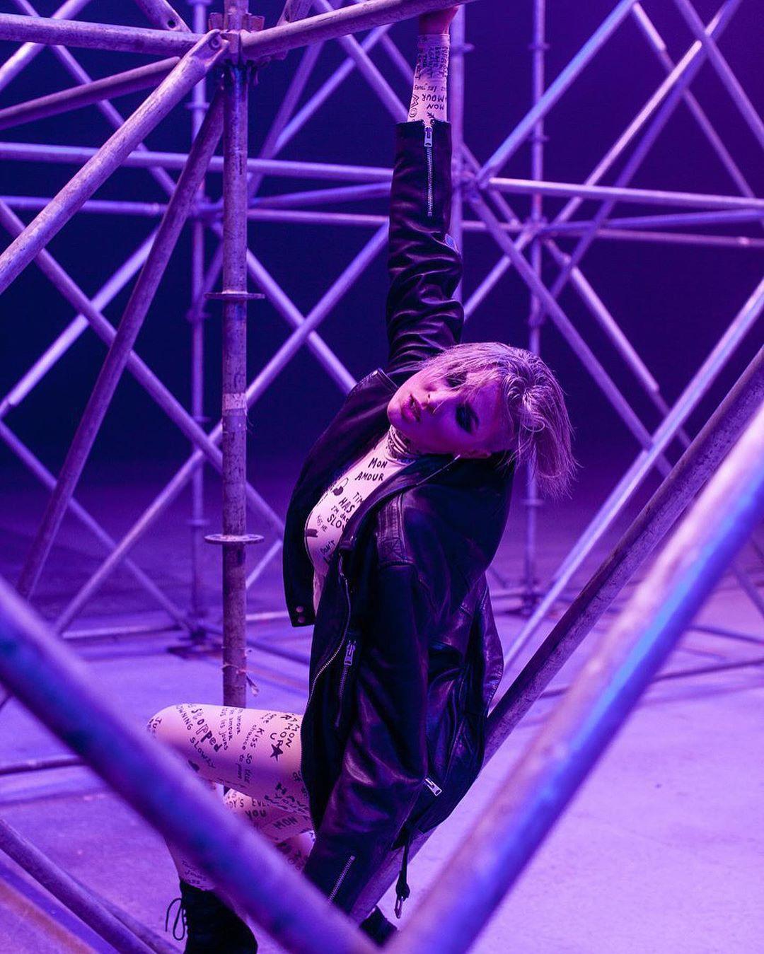На серии других снимков певица с короткими волосами оттенка блонд. Она танцует на пилоне в телесном полупрозрачном комбинезоне с надписями из текста песни Mon Amour. Пикантный образ дополнила кожаная куртка.