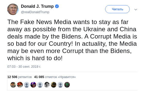 "Фейк-ньюз медиа хотят быть как можно дальше от украинских и китайских сделок, заключенных Байденом. Коррумпированные медиа так вредны для нашей страны! На самом деле, СМИ могут быть еще более коррумпированными, чем Байдены, что трудно сделать!", - написал президент США.