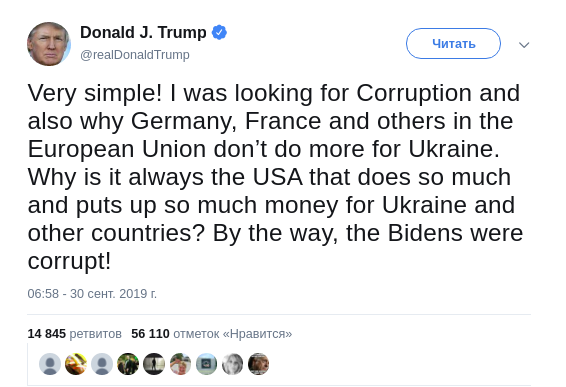 В серии постов в Twitter Трамп обвинил Евросоюз в недостаточной помощи Украине и назвал Байденов коррумпированными.
