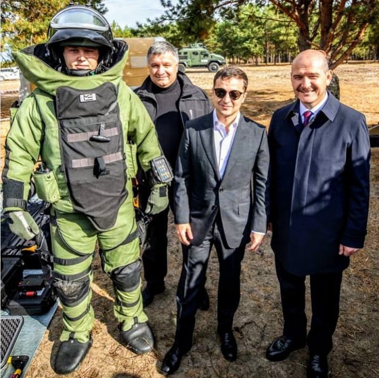 Как видно на фото, Аваков стоит с Зеленский и министром МВД Турции Сулейманом Сойлу вместе с сапером ГСЧС в специальном обмундировании.