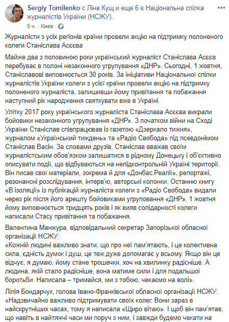 Украинские журналисты провели всеукраинскую акцию в поддержку коллеги Станислава Асеева, который уже два с половиной года находится в плену "ДНР". 1 октября ему исполняется 30 лет. Акция прошла по инициативе НСЖУ, о ней сообщил его глава Сергей Томиленко.