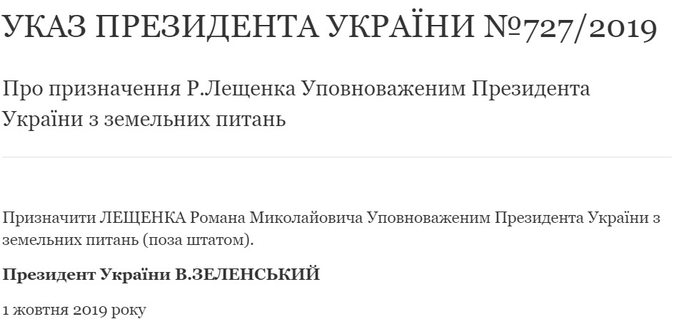 Глава Украины Владимир Зеленский назначил Романа Лещенко уполномоченным президента Украины по земельным вопросам (вне штата).