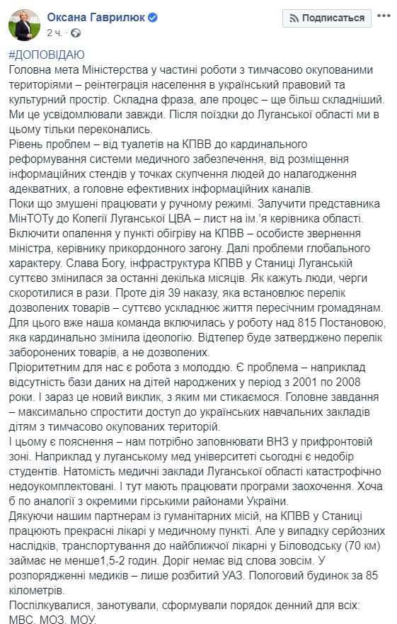 "С 29 октября должны были измениться правила пересечения КПВВ между временно оккупированными территориями и подконтрольными украинской власти, в частности, для детей до 14 лет. По новым правилам при пересечении линии разграничения дети должны были бы иметь загранпаспорт. Получив многочисленные обращения граждан и проанализировав ситуацию, Министерство по делам ветеранов, временно оккупированных территорий и внутренне перемещенных лиц приняло решение о необходимости отсрочить вступление в силу этих правил", - говорится в сообщении властей