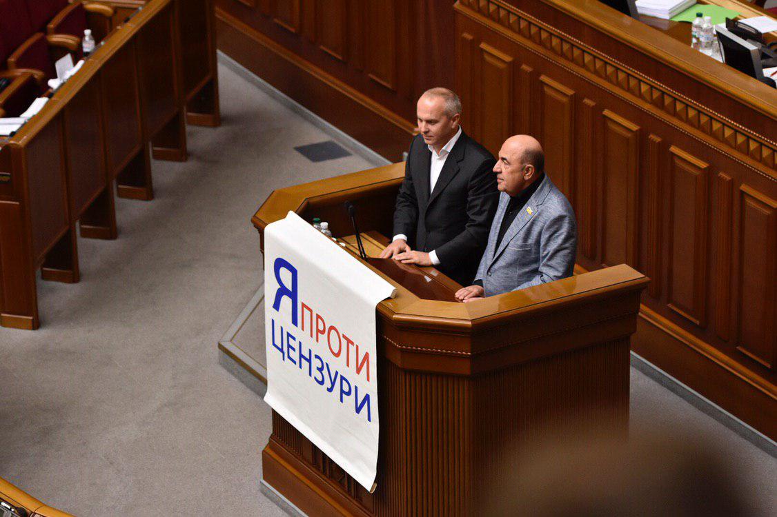 10:15 Нардепы от Оппозиционной платформы Нестор Шуфрич и Вадим Рабинович. Они повесили на трибуне плакат "Я против цензуры"