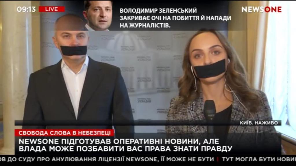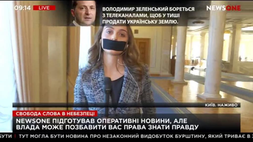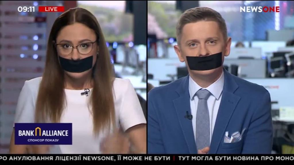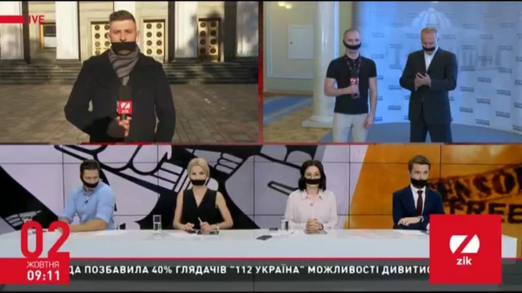 На полчаса каналы прекратили активное вещания. В знак протеста против цензуры они показывают кадры с людьми, которые находятся в студиях с заклеенными черным скотчем ртами.