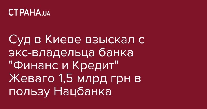 В Шевченковском районном суде Киева 1 октября приняли решение взыскать с бывшего владельца банка "Финансы и кредит" Константина Жеваго 1,539 млрд грн в пользу Национального банка Украины (НБУ) в счет погашения долга банка по кредита рефинансирования, которые были предоставлены ранее. Об этом сообщает пресс-служба Нацбанка.