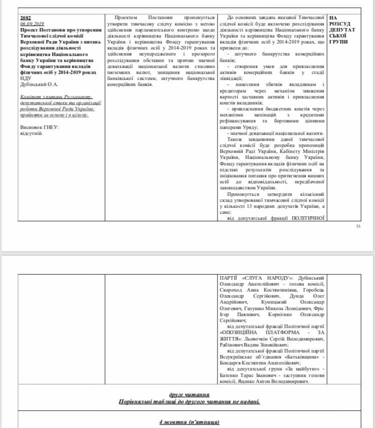 Дубинский намерен лично возглавить комиссию и взять себе в заместители сопредседателя депутатской группы "За будущее", главу партии "Укроп" и экс-директора "Магистральных газопроводов "Дружба" Тараса Батенко. Согласно проекту, в комиссии будет еще 13 членов, из которых семь - от "Слуги народа", а также Сергей Левочкин и Вадим Рабинович от "Оппозиционной платформы - за жизнь", Константин Бондарев от "Батькивщины", внефракционный Антон Яценко и пока по одному неопределенному кандидату от "Голоса" и "Европейской солидарности".