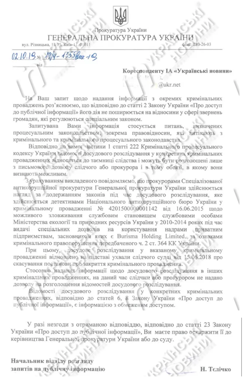 Как сказано в ответе ГПУ, НАБУ проводит досудебное расследование в уголовном производстве от 16 марта 2015 года по ч. 2 ст. 364 (злоупотребление властью или служебным положением) Уголовного кодекса. Оно касается возможного злоупотребления служебным положением чиновниками Министерства экологии и природных ресурсов в 2010-2014 годах. В частности, изучается факт выдачи специальных разрешений на пользование недрами компании Burisma.