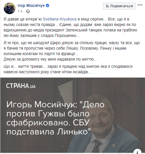 Экс-нардеп Игорь Мосийчук отреагировал на публикацию "Страной" его интервью и заявил, что все изложенное - правда. А сейчас он работает над книгой, которая весной 2020-го может стать хитом инсайдов. Об этом он написал на своей странице в соцсети.