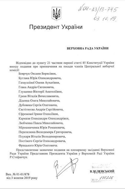 "В соответствии с пунктом 21 части первой статьи 85 Конституции Украины вношу представление о назначении на должности членов Центральной избирательной комиссии", - сказано в документе.