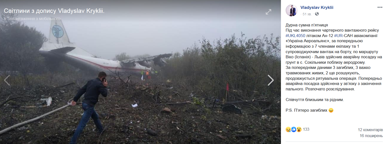 "Во время выполнения чартерного грузового рейса UKL4050 самолет Ан-12 UR-CAH авиакомпании "Украина Аэроальянс", по предварительной информации с 7 членами экипажа и 1 сопровождающим груз на борту, по маршруту Вико (Испания) - Львов совершил аварийную посадку на грунт в с. Сокольники вблизи аэродрома. По предварительным данным 3 погибших, 3 тяжело травмированных живых, 2 еще разыскивают, продолжается спасательная операция. Предварительно аварийная посадка осуществлена в связи с окончанием горючего. Начато расследование. Соболезнования близким и родным.