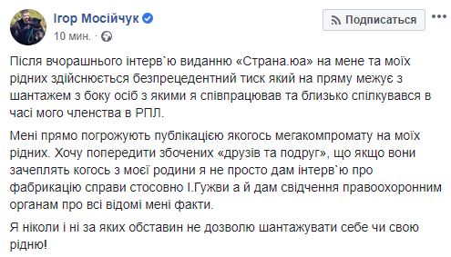 "После вчерашнего интервью изданию "Страна.юа" на меня и моих родных осуществляется беспрецедентное давление, которое напрямую граничит с шантажом со стороны лиц, с которыми я сотрудничал и близко общался во времени моего членства в РПЛ", - написал Мосийчук.