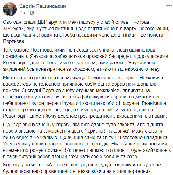 "Сегодня следователи ГБР вручили мне подозрение по старому делу - "делу Химикуса", решается вопрос о взятии меня под стражу. Убежден, что реанимация дела и попытка посадить меня в тюрьму – это месть Портнова. Того самого Портнова, который на посту заместителя главы администрации президента Януковича обеспечивал правовой беспредел в отношении участников Революции достоинства. Того самого Портнова, который вместе с Януковичем вынужден был скитаться за границей, скрываясь от народного гнева", - подчеркнул он.