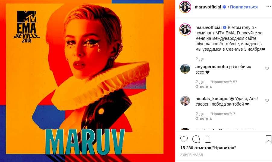 Победительница национального отбора на Евровидение-2019 певица MARUV уже претендует на звание лучшей артистки России в конкурсе ЕМА 2019, который проводит MTV, выбирая лучших артистов в нескольких странах. Об этом говорится на сайте премии.