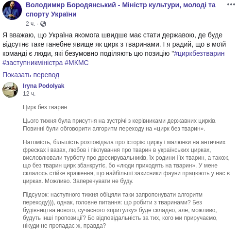 "Но большинство рассказывало об истории цирка и рисунках на древних фресках и вазах, любви и заботе о животных в украинских цирках, выражали заботу о дрессировщиках, их семьях и их животных, а также, что без животных цирк обанкротится, ибо "люди приходят на животных", - написала замминистра.