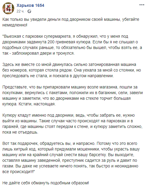 "Выезжая с парковки супермаркета, я обнаружил, что у меня под дворниками задвинута 200-гривневая купюра. Если бы я не слышал о подобных случаях раньше, то обязательно бы вышел, чтобы взять ее, а так - заблокировал двери и тронулся", - пишет администратор сообщества.
