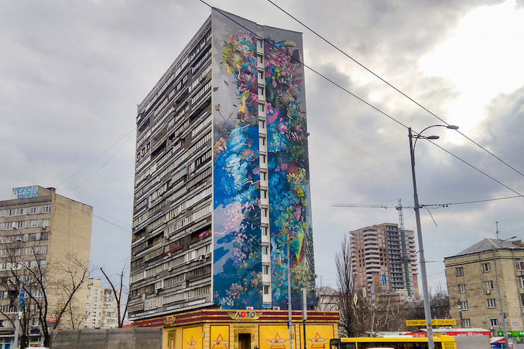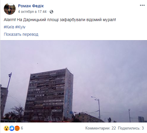 В Киеве на Дарницкой площади зарисовали мурал, который 3 года назад создал известный художник из Майами. На это в Facebook обратил внимание киевлянин Роман Федик.