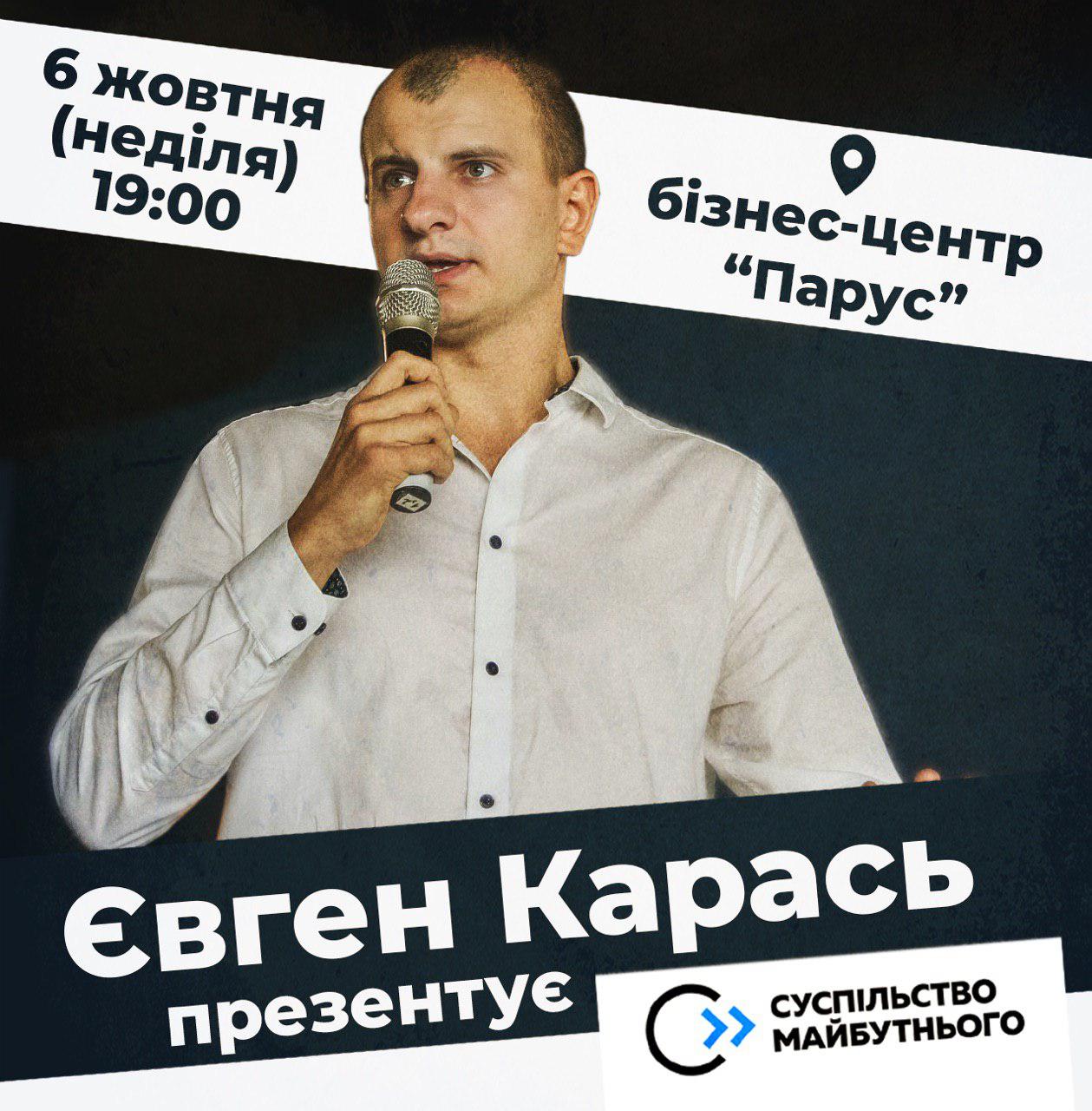 Евгений Карась проведет презентацию политическое движения "Общество будущего" в бизнес-центре "Парус" в 19:00. В описании канала речь идет о том, что организация, которую будет презентовать лидер "С14", - это "объединение общественных деятелей, ветеранов, активистов и неравнодушных украинцев", цель которого - "актуальная в глобальных масштабах страна".