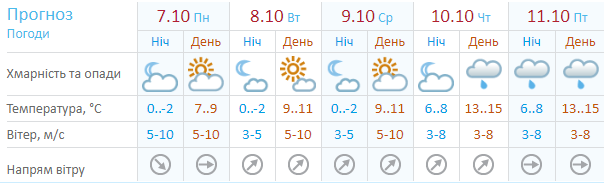 Ресурс Мeteoprog.ua дает такой прогноз: понедельник днем +7, ночью +4; вторник днем +10, ночью +1, среда днем +10, ночью +5. Резко потеплеет в четверг: днем воздух прогреется до +16, ночью +8, пятница днем +14, ночью +9. На выходных ресурс обещает, что станет еще теплее: +17...+21 днем. Небольшой дождь возможен в субботу.