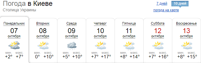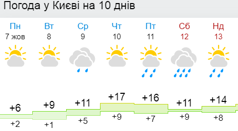 По данным сайта Sinoptik.ua, неделя в Киеве начнется с +7...+10 днем. Ночью с понедельника на вторник ночью обещают 0. В среду, 9 октября, этот ресурс прогнозирует дождь, а с четверга - потепление сразу до +14...+17 вплоть до воскресенья. Зонтики пригодятся в пятницу, 11 октября, в остальные дни переменная облачность без осадков.