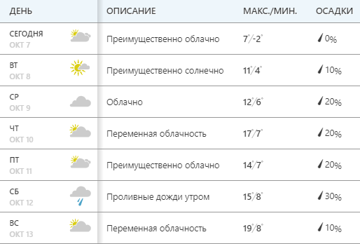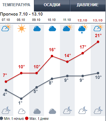 Сайт Weather.com сообщает, что самый холодный день этой недели - понедельник. 7 октября градусники не поднимутся выше +7, а ночью будет мороз до -1. Во вторник-среду днем +11...+12, ночью +4...+6.  10 октября воздух прогреется до +17, ночью +7. В пятницу +14 днем. В субботу дождь и +15. В воскресенье без осадков: до +19.