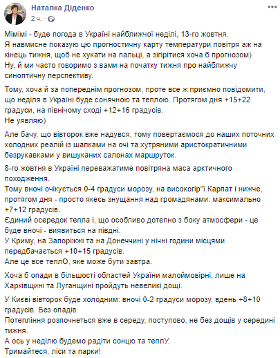 Синоптик ресурса Opogode отозвалась о погоде в ближайшие выходные так: "мимими". В Украине днем установятся +15...+22, а погода будет солнечной. Но начнется неделя с холодов.