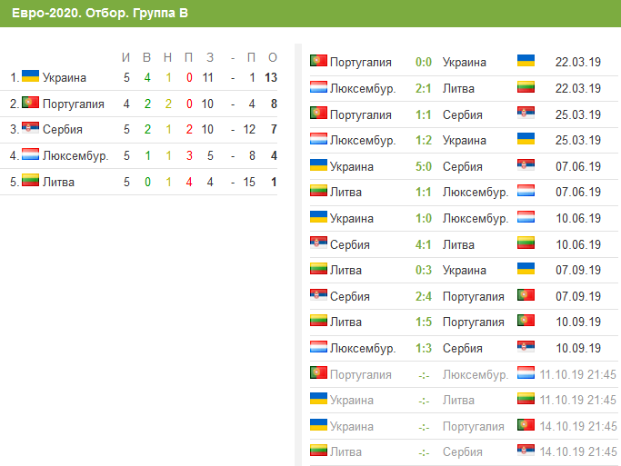 Отборочный турнир на Евро-2020. Положение в группе в на 7 октября 2019 года