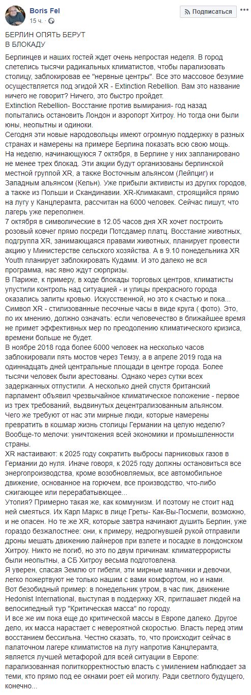"Чего же требуют от нас эти мирные люди, которые намерены превратить в кошмар жизнь столицы Германии на целую неделю? - пишет Фель. - Вообще-то мелочи: уничтожения всей экономики и промышленности страны. ХR настаивают: к 2025 году сократить выбросы парниковых газов в Германии до нуля. Иначе говоря, к 2025 году должны остановиться все энергопроизводства, кроме возобновляемых, все автомобильное движение, основанное на горючем, все производство, что-либо сжигающее или перерабатывющее...