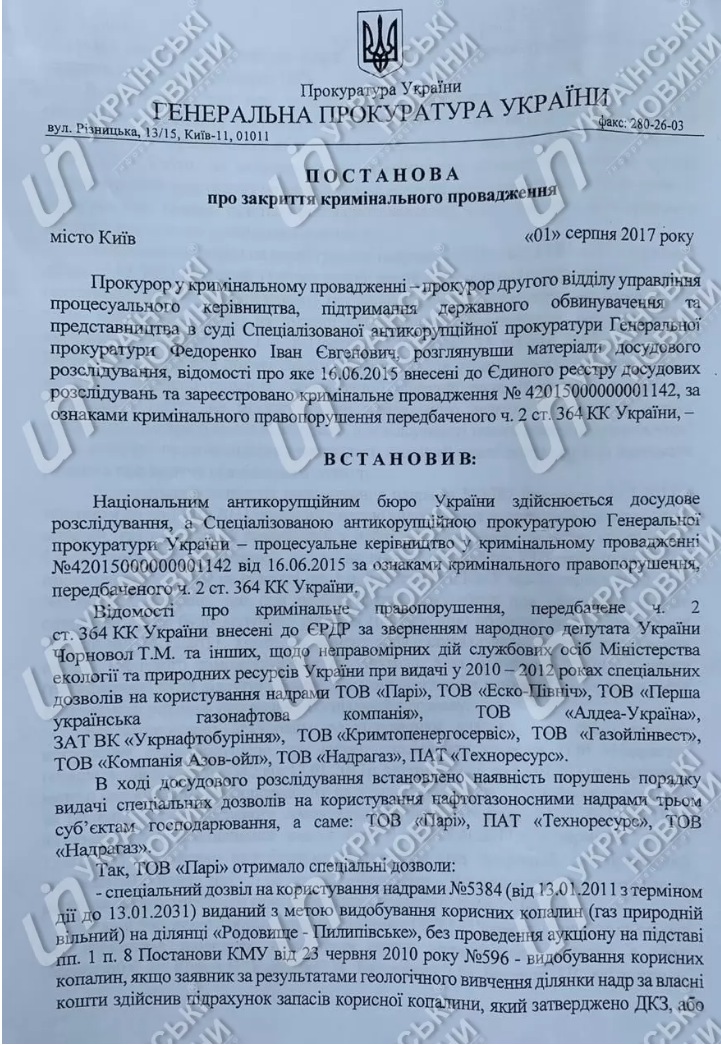Генпрокуратура еще в 2017 году закрыла дело по факту возможного злоупотребления служебным положением чиновниками Министерства экологии и природных ресурсов при выдаче специальных разрешений на пользование недрами группе компаний Burisma из-за неэффективного расследования, которое вели детективами НАБУ.