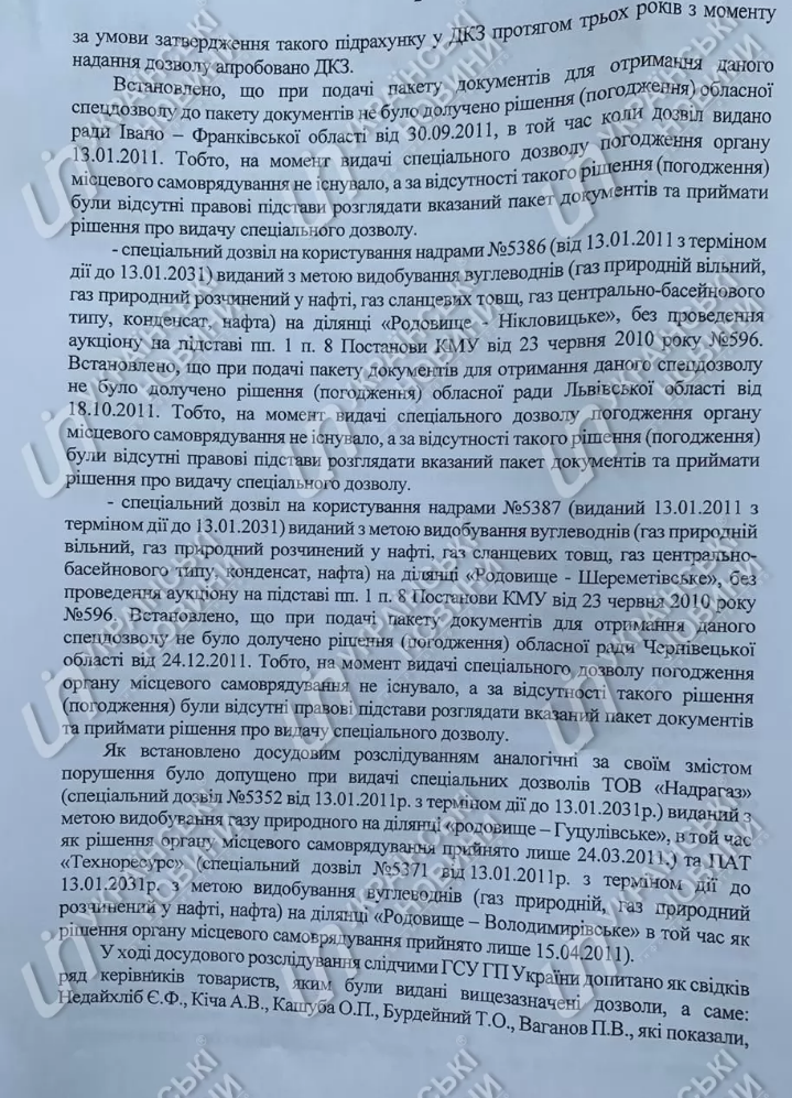 В постановлении о закрытии уголовного производства уточняется, что дело расследовалось с июня 2015 года по статье 364 Уголовного кодекса (злоупотребление властью или служебным положением) Уголовного кодекса. В ходе досудебного расследования были допрошены в качестве свидетелей руководители предприятий, которым были выданы разрешения на пользование недрами,а также члены комиссий, которые принимали решения о выдаче спецразрешений.