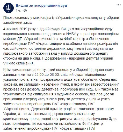 "4 октября 2019 года следственный судья Высшего антикоррупционного суда удовлетворила ходатайство детектива НАБУ по делу о завладении имуществом ГП "Укрзализнычпостач" и Филиала "Центр обеспечения производства" АО "Укрзализныця" в особо крупных размерах во время осуществления последним государственных закупок и применила к подозреваемому меру пресечения в виде домашнего ареста сроком на два месяца. Подозреваемый - народный депутат Украины VIII-ого созыва", - заявляет пресс-служба.