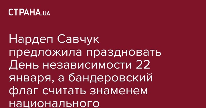 Внефракционная народная депутат и член партии "Свобода" Оксана Савчук предложила установить 22 января днем независимости, а красно-черный флаг считать знаменем национально-освободительной борьбы украинского народа. Соответствующие проект постановления № 2205 и законопроект № 2229 зарегистрирован на сайте ВР.