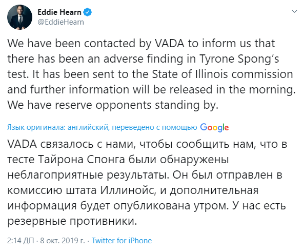 "С нами связались из VADA и сообщили, что допинг-тест Спонга показал неудовлетворительные результаты. Сейчас дело отправлено в атлетическую комиссию штата Иллинойс. Дополнительная информация будет опубликована позже. У нас есть резервные соперники", - написал в соцсети Хирн.