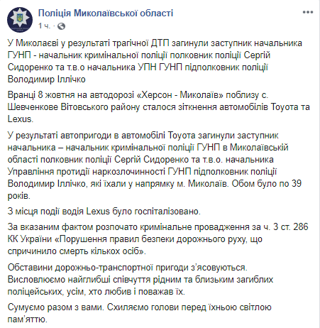 Утром во вторник, 8 октября, в Николаевской области произошло ДТП, в результате которого погибли два полицейских начальника. Об этом сообщает пресс-служба полиции Николаевской области в Facebook.