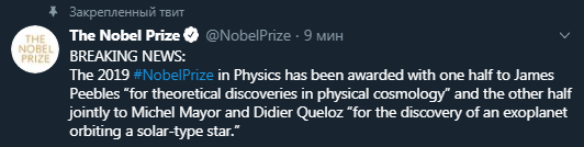 Половину премии присудили Джеймсу Пиблсу "за теоретические исследования в космологии", вторую - Мишелю Майору и Дидье Кело "за открытие экзопланеты на орбите солнцеподобной звезды".