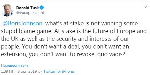 В то же время, в Европе выразили обеспокоенность позицией Великобритании. "На карту поставлено будущее Европы и Великобритании, а также безопасность и интересы наших людей. Вы не хотите сделки, вы не хотите продления, вы не хотите отмены, quo vadis?" - написал председатель Евросовета Дональд Туск в своем Twitter. По его словам, речь "не о победе в некой игре".