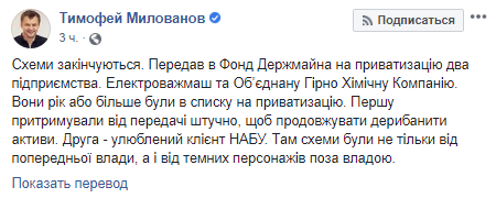 "Схемы заканчиваются. Передал в Фонд госимущества на приватизацию два предприятия. Электротяжмаш и Объединенную горно-химическую Компанию. Они год или более были в списке на приватизацию. Первую придерживали от передачи искусственно, чтобы продолжать дерибанить активы. Вторая - любимый клиент НАБУ. Там схемы были не только от предыдущей власти, а и от темных персонажей вне власти", - написал Милованов.