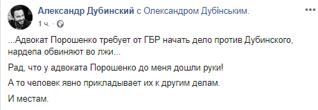 "Адвокат Порошенко требует от ГБР начать дело против Дубинского, нардепа обвиняют во лжи... Рад, что у адвоката Порошенко до меня дошли руки! А то человек явно прикладывает их к другим делам. И местам", - написал на своей странице в соцсети Дубинский и подкрепил свой пост информативной картинкой.