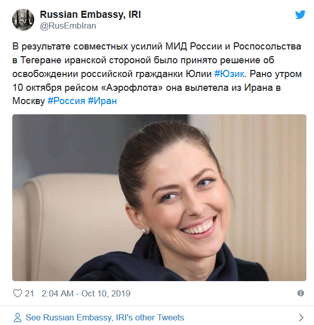 Напомним, что Юлия Юзик прилетела в Иран 29 сентября, а 2 октября ее задержали в отеле сотрудники Корпуса стражей исламской революции. Журналист Борис Войцеховский сообщил, что россиянку обвинили в шпионаже в пользу Израиля. Европейская федерация журналистов (EFJ) призвала власти Исламской Республики отпустить Юзик. Члены EFJ убеждены в отсутствии доказательств ее вины. Позднее представитель иранского правительства Али Рабеи заявил, что задержание вызвано визовыми проблемами и не связано со шпионажем.