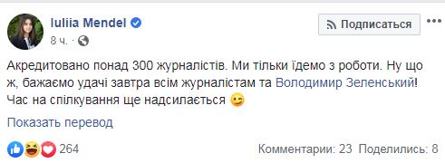 Первая пресс-конференция Зеленского 10 октября в формате марафона, которую сегодня устраивают на столичном фудкорте Kyiv Food Market, может продолжаться 10 часов. Об этом заявила пресс-секретарь президента Юлия Мендель в Facebook.