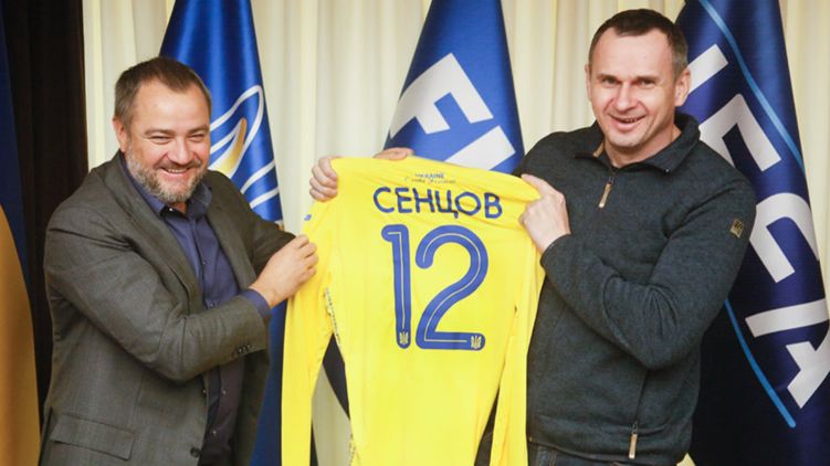 Вчера, 9 октября, в Доме футбола побывал известный активист, кинорежиссер, писатель, сценарист и болельщик сборной Украины Олег Сенцов. Президент Украинской ассоциации футбола, член исполкома УЕФА Андрей Павелко подарил ему футболку сборной Украины под символичным номером 12.